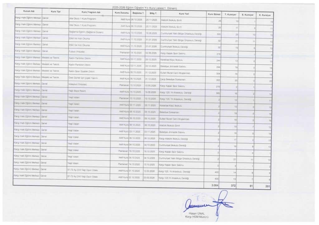 2025-2026 Eğitim Öğretim Yılı İlk Dönem Kurs Listesi